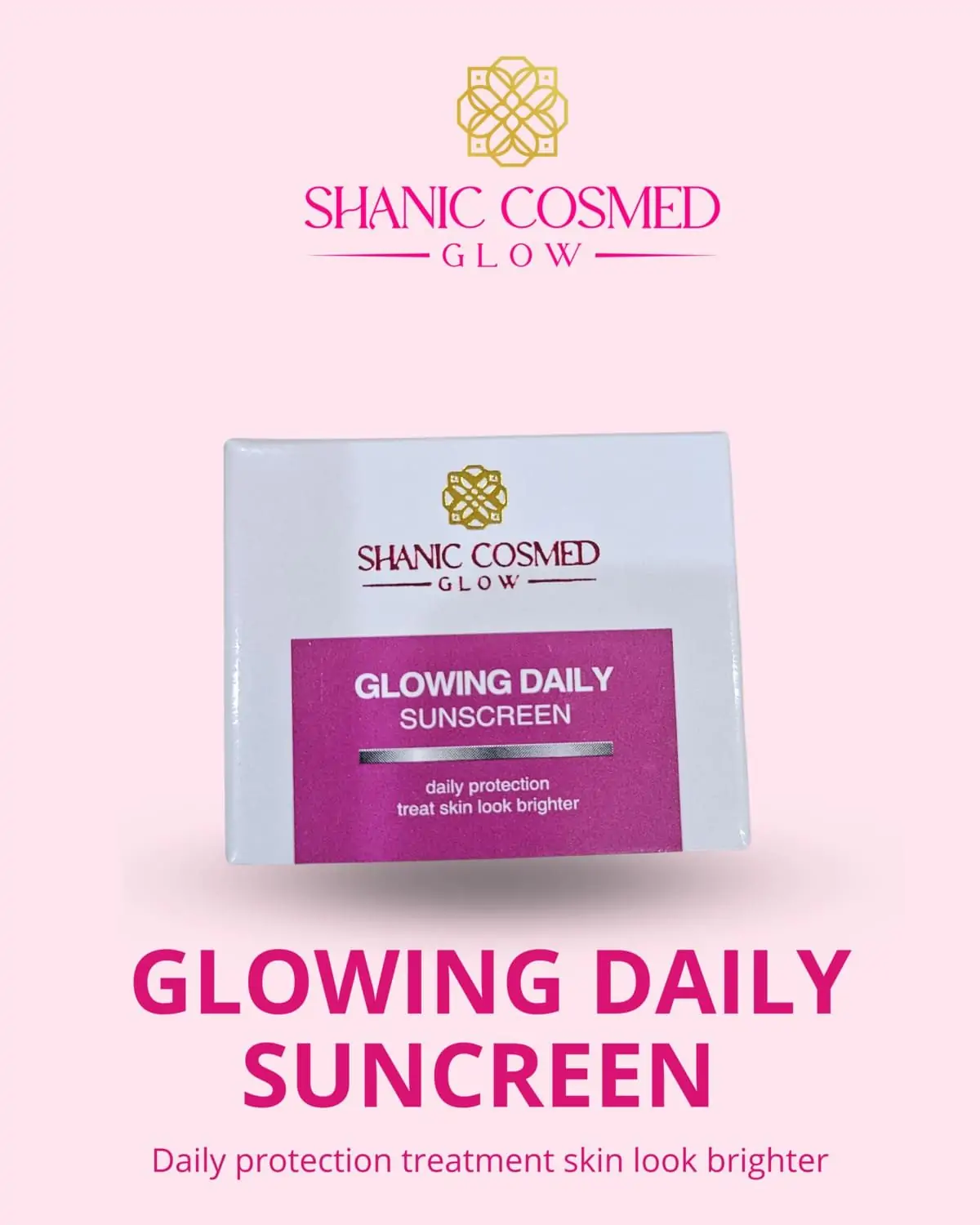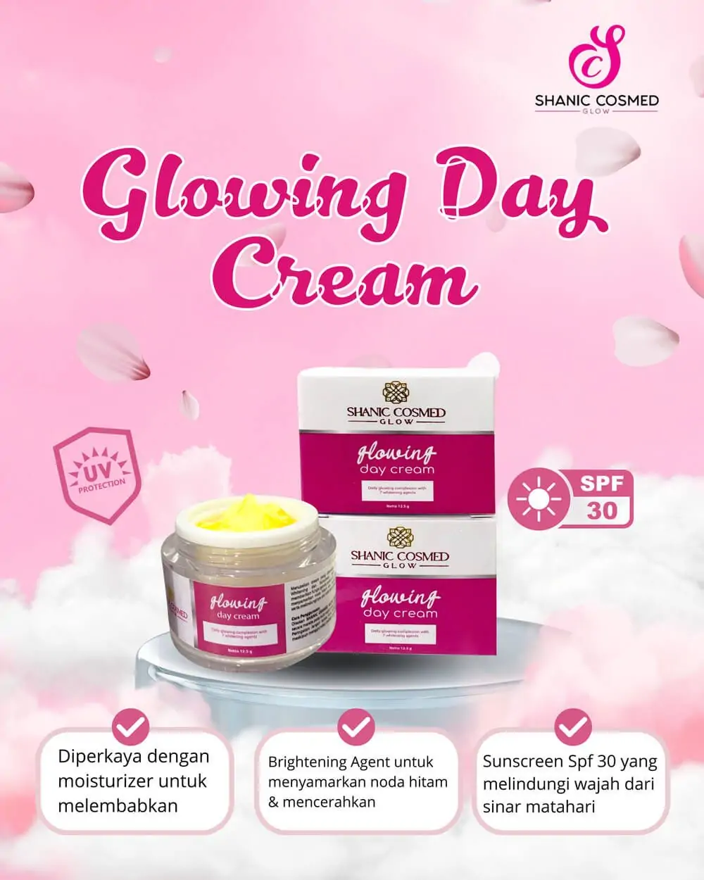 Glowing day cream merupakan cream yang di perkaya dengan Moisturizer. Whitening dan sunscreen agent sehingga dapat memberikan fungsi ganda pada kulit . Dapat melembabkan menyamarkan noda hitam dan mencerhakan kulit wajah serta melindunginya dari efek buruk sinar matahari dengan spf 30.